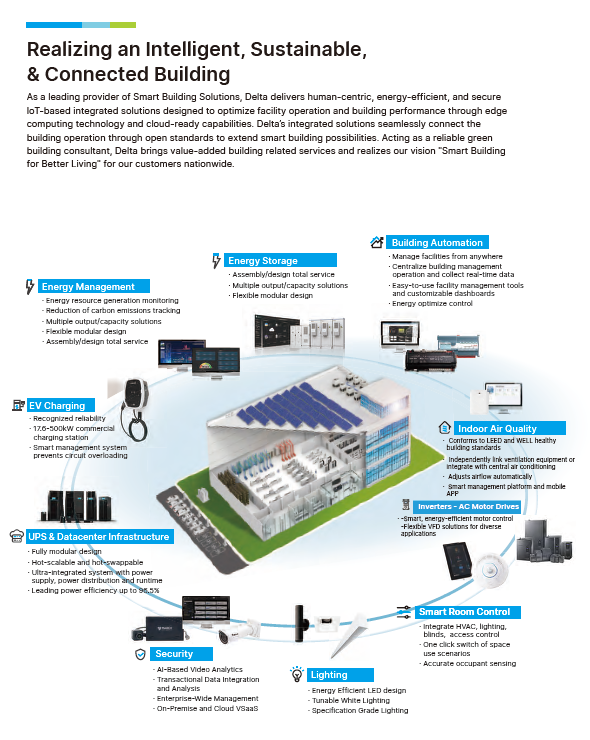 Dan Cremins: Delta Electronics offers end-to-end solutions that address clients’ needs for green buildings for environmental, social and governance (ESG), sustainability, carbon reduction and creating a building environment promoting occupant health, safety and security.