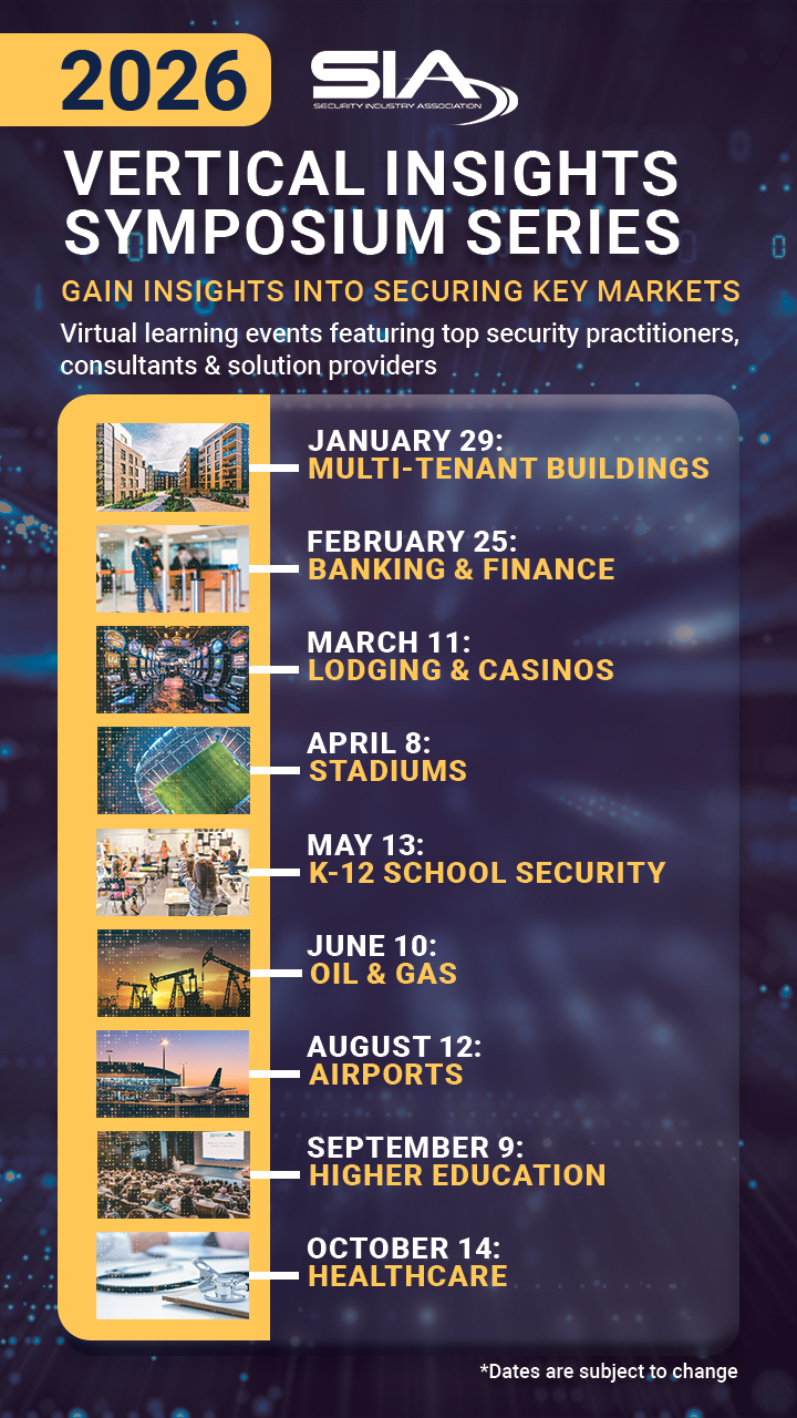 Vertical Insights is a series of virtual events presented by SIA and focused on top vertical markets. This series is designed to bring together practitioners, security integrators, solution providers, consultants and others involved in protecting key sectors like retail, education, transportation, health care and more.